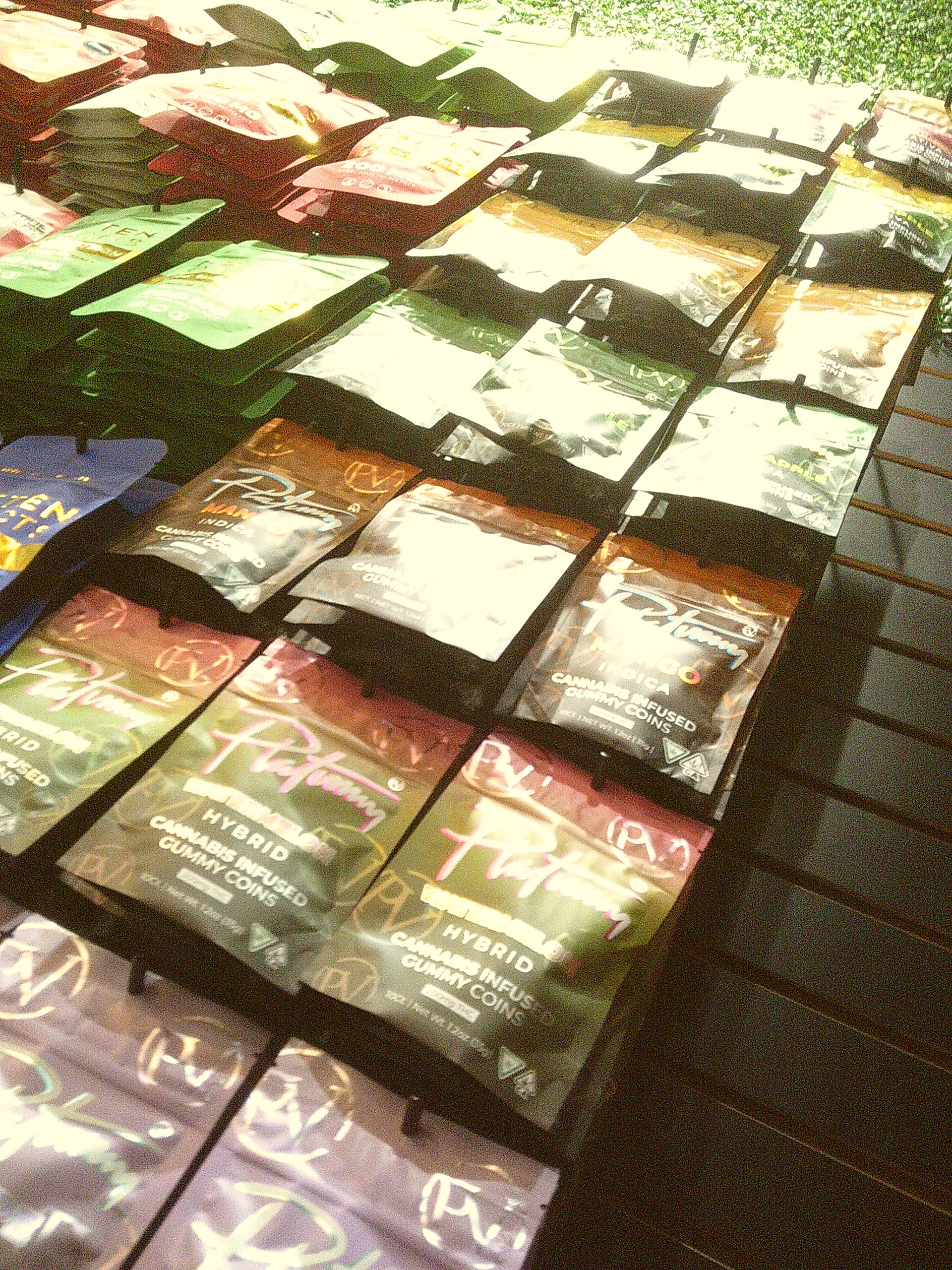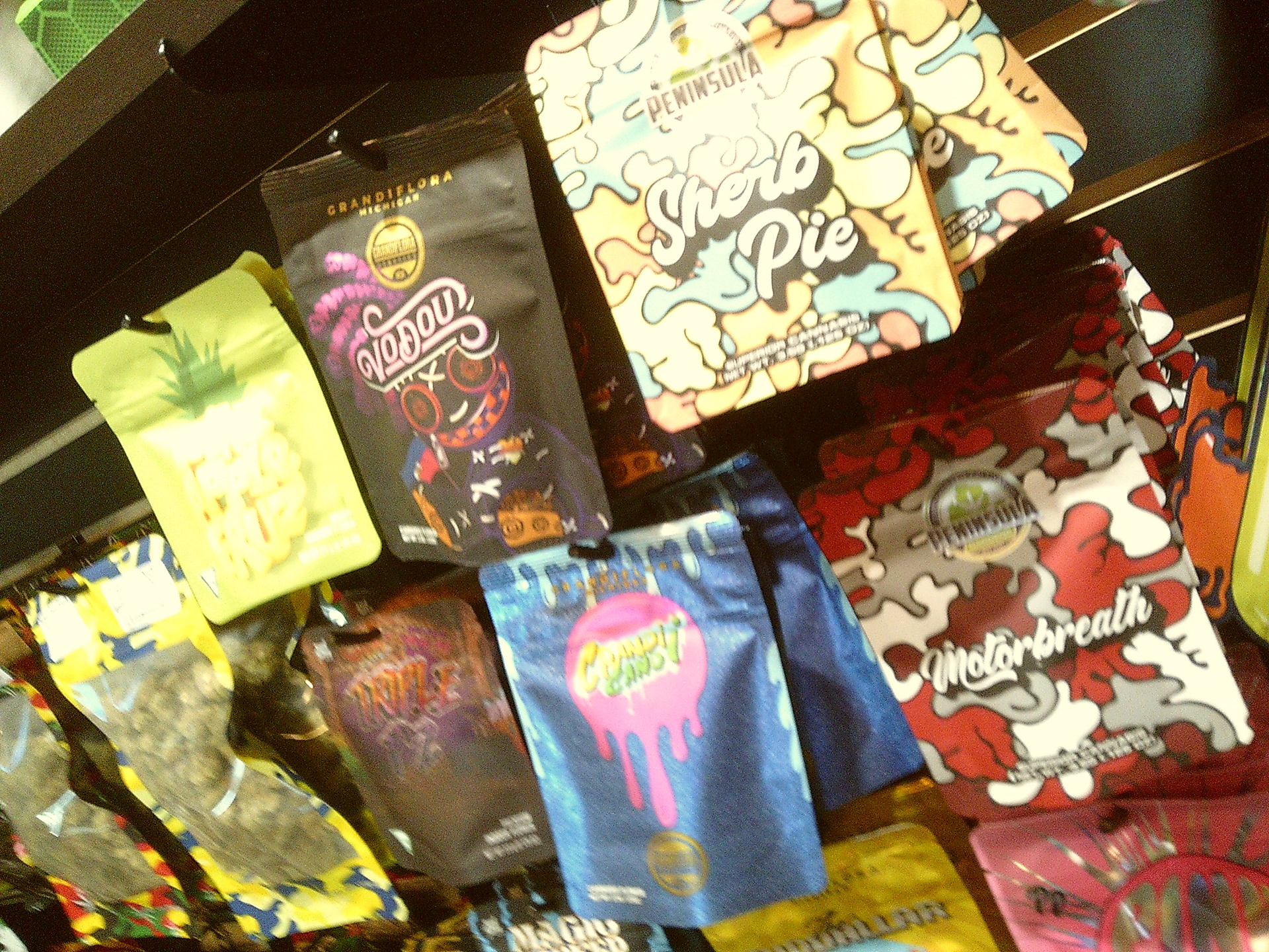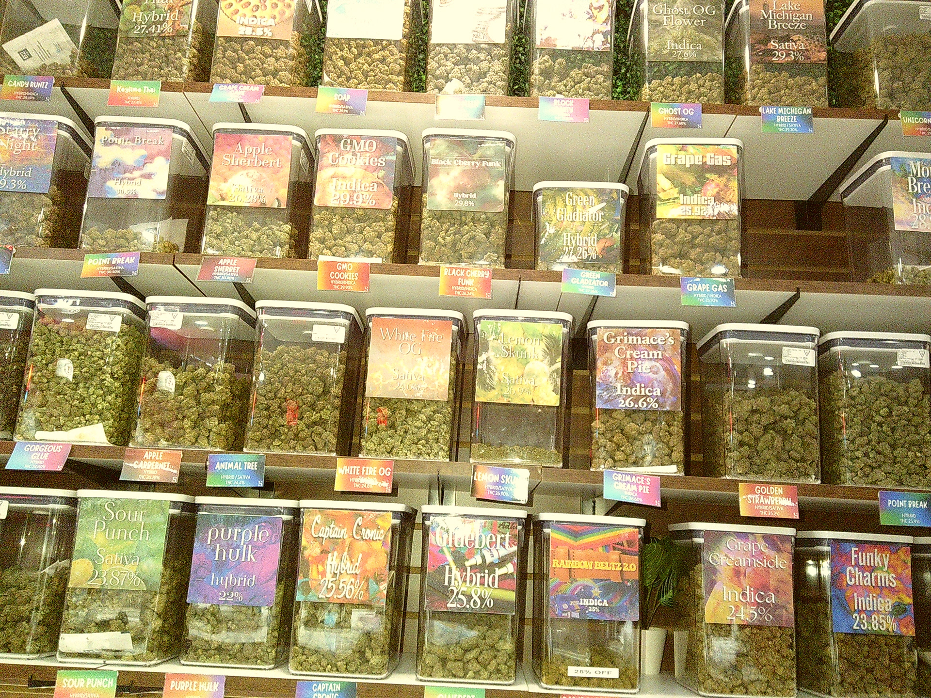 Each of these images shows the display design for strains previously available to purchase in the shop. Each display features the name of the cannabis strain, the strain type, and THC percentage