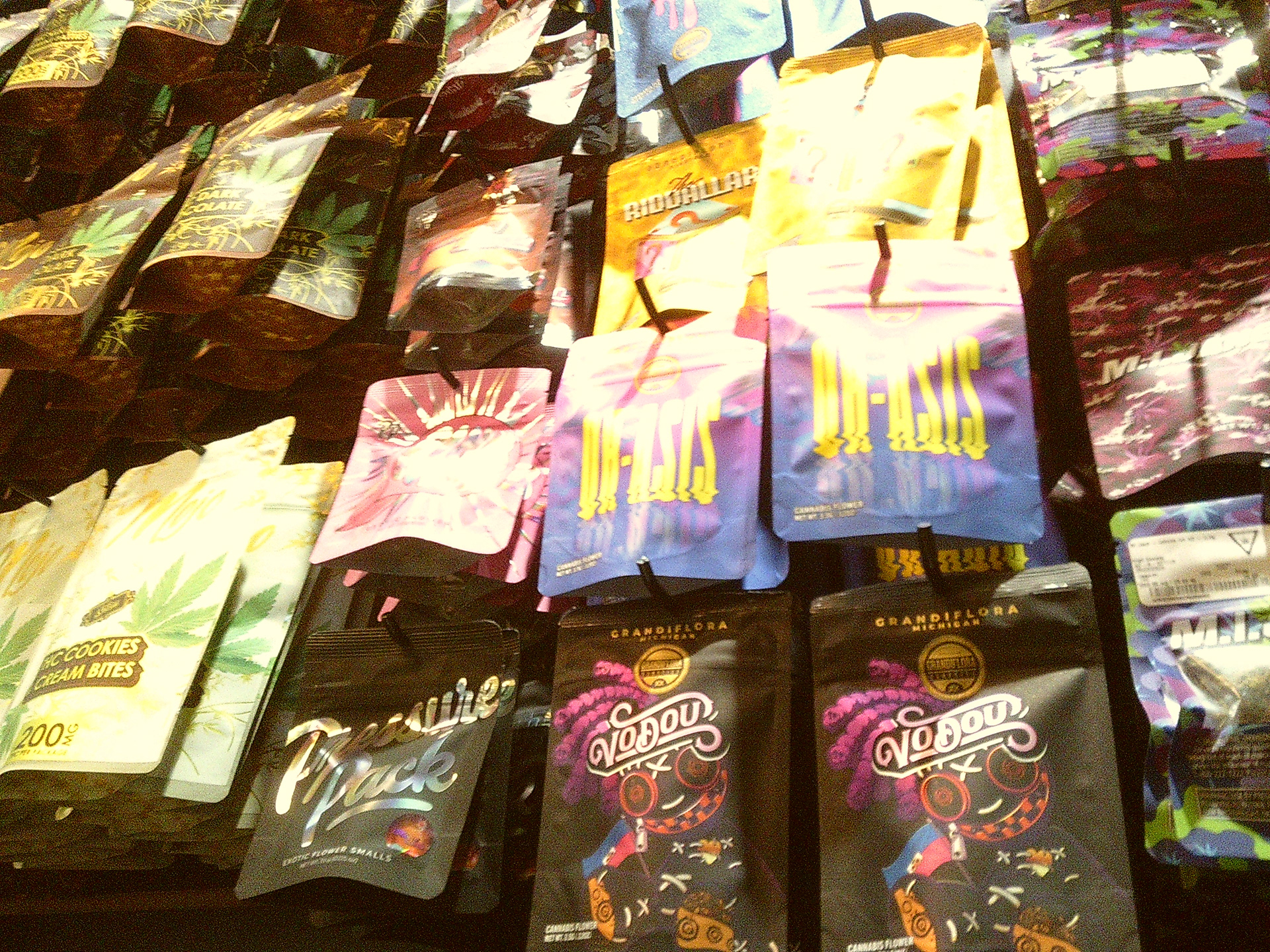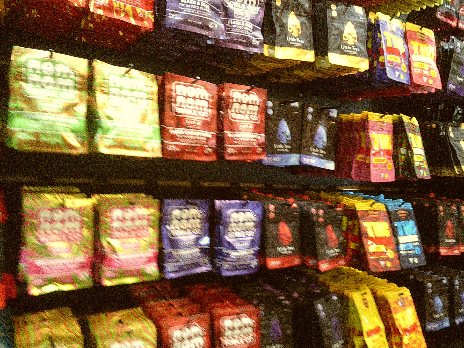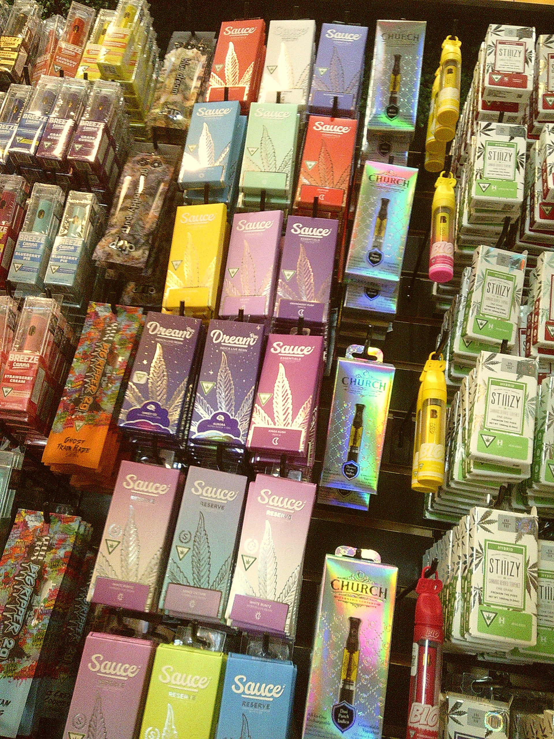 Each of these images shows the display design for strains previously available to purchase in the shop. Each display features the name of the cannabis strain, the strain type, and THC percentage